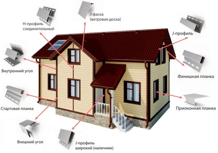 За украса на ъглите е по -добре да използвате специални допълнителни елементи. В този случай ъгловият елемент първо се монтира, а след това стенният панел се вкарва и фиксира зад него. Сложните архитектурни елементи, както и прозорците и други отвори също са украсени със специални допълнителни елементи, надвесите на покрива са подгънати със софити.