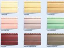 Виниловият сайдинг е опция, показваща разнообразие от цветове. Основният обем на пазара се състои от материал със спокойни пастелни и светли нюанси – розово, бежово, светло зелено, светло сиво, светло кафяво и др. Те се получават чрез смесване на необходимия пигмент в белия състав. Панелите с ярки нюанси се произвеждат по малко по -различна технология – червено, наситено синьо, черешово, оранжево и пр. Те са представени в малко по -малък обем, тъй като не са толкова популярни, колкото по -спокойните нюанси.