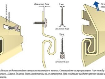 Самонарезните винтове трябва да се завинтват строго перпендикулярно и това трябва да стане през специални отвори. Не забивайте директно крепежните елементи, това ще доведе до напукване на материала. Между главата на винта и повърхността трябва да има малко разстояние (приблизително равно на дебелината на монетата). Първо трябва да фиксирате винтовете отгоре, така че панелът да виси на първите винтове, докато завивате крепежните елементи, разположени по -ниско.