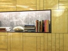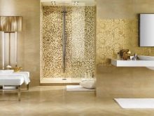 - Керамични плочки. Повечето от тях са в един панел, тъй като имат успокояващ еднообразен цвят, приличат на дизайнер и се съчетават добре с други интериорни детайли. Добавят се различни златосъдържащи смеси за постигане на позлатен ефект..