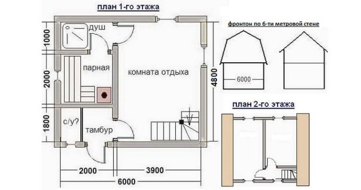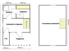 По желание банята може да бъде направена на 2 етажа. Сега няма да изненадате никого с това, но такова решение ще донесе много ползи. Достатъчно е да се отбележи, че вторият етаж всъщност ще бъде стая с размери 6×4 метра, в която можете да подредите удобна зона за отдих или да оборудвате стаи за гости.