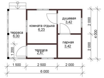 Схемата за сауна 4х6 не е само парна баня и пералня. Може да бъде оборудван с покрита веранда за комфортно прекарване през студения сезон, открита тераса за релакс през лятото.
