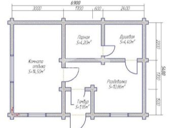 Когато съставяте чертеж на бъдещата структура, е необходимо предварително да помислите за местоположението и размера на стаите. Например площта на съблекалнята, която предотвратява проникването на студен въздух в помещението, се измерва в размер на 1,3 м2 на човек плюс мястото, където ще се съхраняват нещата и принадлежностите за баня.