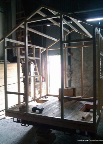 Също така, едно от предимствата е фактът, че за изграждането на транспортируема баня, не е необходимо да запълвате основата, да извършвате допълнителни работи с различни нива на сложност. Тук всичко е съвсем просто: първо сглобяваме тази конструкция, след това фиксираме рамката, обшиваме я, извършваме довършителните работи и монтираме фурната.