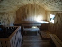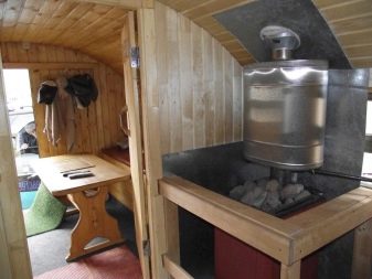 Вътрешното пространство на такава подвижна парна баня може да бъде разделено на секции от парна баня и съблекалня. Тук трябва да се отбележи, че резервоарите за вода в мобилната баня няма да издържат, тъй като свободното пространство ще бъде много ограничено. В тази връзка обхватът на приложение на такава баня също е ограничен – до водните обекти. В същото време водата може да се нагрява на печката и да се източва през специално предвидено за това изтичане.