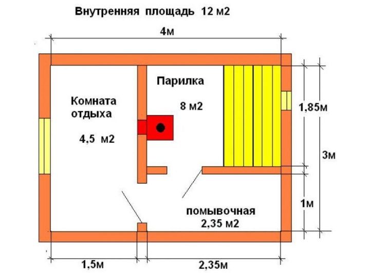 Трябва да се има предвид, че дори най -добрите бани от експандирани бетонни блокове отстъпват на дървените конструкции по отношение на термичната защита. Изсушеният боров дървен материал позволява преминаването на половината топлина от изолационния експандиран бетон и ако строителството се извършва по безрамкова технология, разликата става вече петкратна. Специфичното тегло на материала е приблизително 1000 кг на 1 кубичен метър. м. Повече точни параметри за окончателния проект могат да бъдат намерени в документацията на производителя. Сравнително компактна баня с площ от 9 кв. м. е построен на един етаж и обикновено е разделен на три секции:
