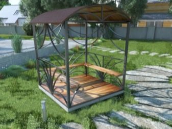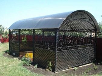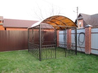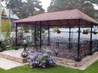 Ако въпреки това собствениците на сайта са объркани от грубия вид на метала, тогава в този случай на помощ идват оригинални идеи, свързани с художествено коване. Но коването на различни модели и детайли е скъпо, но такава красота ще продължи дълго. Друг плюс на метала е, че може да се комбинира с други материали. Като пример – беседка с метална рамка и покрив от поликарбонат.
