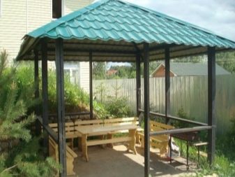 - Прост монтаж на конструкцията. Много по -лесно е да се изгради беседка от профилна лента, елементите се сглобяват като конструктор.