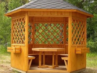 Конструкцията на шестоъгълна беседка трябва да се третира с особена отговорност. Ако има нужда от леко увеличаване на свободното пространство, тогава пейките могат да бъдат вградени в конструкцията. По този начин те ще заемат много по -малко място..