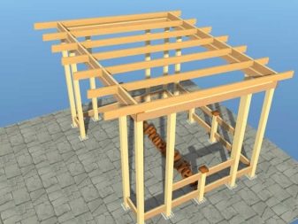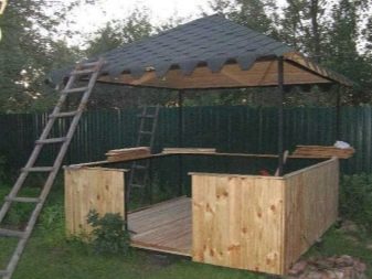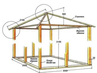 Струва си да започнете покрива с рамката. За квадратни беседки най-подходящи са четирискатни покриви, но най-лесно е да се изгради едноскатен. Рафтовите крака се изрязват от дървения материал, те са прикрепени по двойки под ъгъл. Спомагателните подпори са симетрично прикрепени към всеки от краката.
