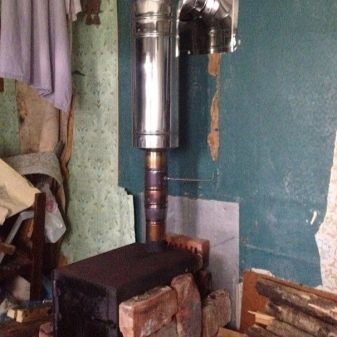 - На този етап коминът е прикрепен. Колкото по -дълъг е нейният участък в стаята, толкова по -топло е в гаража, тъй като той също загрява въздуха около него.