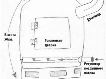 С негова помощ горивото изгаря по -добре, помага за затоплянето на ваната. Разстоянието от горивната камера до пепелника е от 30 сантиметра или повече. Когато коминът е изваден, е необходимо да се монтира амортисьор на вратата (изглед) в качулката, за да се регулира аспираторът.
