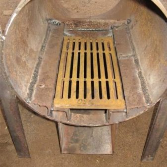 В долната част на 90 -сантиметровия разрез, предназначен за горивното отделение, се изрязва отвор за вентилатора. Тя не трябва да бъде по -тясна от 20 cm и не по -малка от 6 cm на височина. Над отвора е заварена кръгла стоманена плоча с дебелина по -малка от 1,2 см.