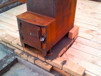 - Печка от този дизайн е монтирана върху бетонна основа, основата трябва да бъде облицована с огнеупорни тухли на височина най-малко 20-30 см с помощта на разтворена глина.