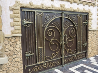 За парцели плъзгащите се врати са идеални. Най -често те са декорирани в кафяви или черни нюанси на цветовата палитра. Тези конструкции, като правило, не са украсени с декор от ковано желязо..