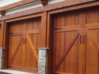 В допълнение към основното предназначение, дървените гаражни врати могат да служат като отличен декоративен елемент. С помощта на дърворезби, необичайни шарки и малки метални вложки можете да добавите оригиналност към дизайна. Важното е разнообразието от текстури, с които можете да направите портата специална. Голямо разнообразие от видове дърво може да се използва за декориране на гаражни врати, най -често срещаните са: