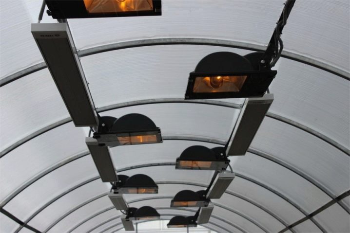 Повечето от тези нагреватели на външен вид приличат на плоска флуоресцентна лампа., в които са разположени лампи или нагревателни елементи. Вътрешната част е оборудвана с отразяваща обвивка, предназначена да фокусира излъчването. IR електрическите нагреватели са мощни и компактни. Най -често те се купуват за домашни оранжерии. В допълнение към електрическите, производителите произвеждат газови инфрачервени нагреватели. Те имат по -голяма топлинна мощност в сравнение с предишното оборудване. Най-често такива инсталации се използват за поддържане на дадена температура в търговски големи оранжерии с височина на тавана най-малко 10 метра. Коксовата пещ или природният газ могат да се използват като източник на енергия.