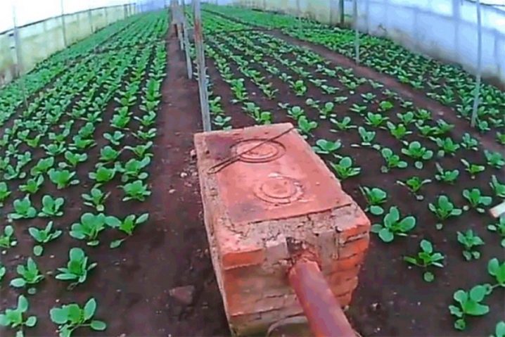 - Тухлена фурна. Структура, която може да се използва за целогодишно отопление. Този дизайн може да бъде изпълнен във всякаква форма и размер (тези параметри директно зависят от площта на оранжерията). Полагането на тази печка се извършва в съответствие със схемите и чертежите за конструкции за баня. Такива устройства имат висока топлинна мощност. Те разпределят равномерно топлинната енергия в целия обем.