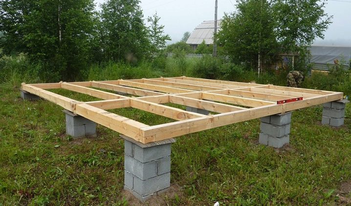 След това можете да преминете към критичния етап на строителството – полагане на основата. В случай на дървен помощен блок не трябва да се излива скъпа бетонна плоча. Тъй като теглото на дървения навес ще бъде незначително, бетонните купчини могат да се използват като основа. Но също така, когато изграждате комунален блок със собствените си ръце, можете да направите колонна основа.