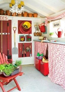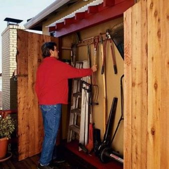 За да поставите лопати, гребла, мотики, трябва да направите специална стойка от OSB. Поставете пластмасови скоби върху него в необходимото количество. Такива устройства са много удобни, те могат да бъдат закупени във всеки магазин за хардуер..