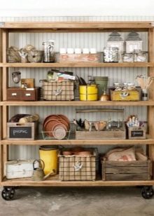 Сега е важно правилно да оборудвате навеса за съхранение на домакински уреди. Първото нещо, което трябва да се направи, са специални платформи с наклон за навиване на всяко колесно оборудване.. Инсталирайте стелажи над тях.