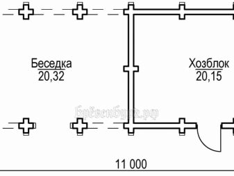 При изключително остър недостиг на пространство можете да комбинирате не само беседка и навес под общ покрив, но и да ги свържете с верандата на къщата. Практиката показва, че това е много удобно и удобно решение. В допълнение към общия покрив, сградата трябва да има ясно изразени остъкляващи елементи.. Една проста комбинирана пристройка за лятна резиденция също може да бъде интересен вариант – външният й вид е показан на чертежа по -долу. Структурата е дълга 11 м и широка 4 м; 20,32 м2 са разпределени за зоната за отдих, а 20,15 м2 за битови нужди.