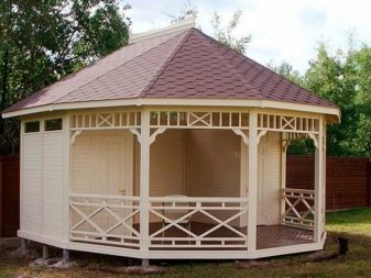 Лятната беседка най -често се подрязва с рендосани дъски, пришити директно върху рамката. Ако използвате схемата за опаковане на рибена кост, комбинираната сграда ще изглежда по -оригинална. По -модерно и надеждно решение е използването на сайдинг. Понякога за боядисване се използват и плоски плочи, DSP и OSB.. Беседки също са украсени с: