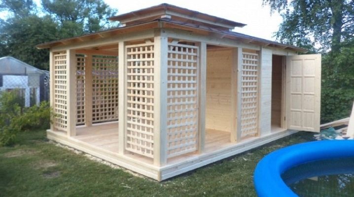 Подготовката на беседка с помощна единица под един покрив често се предприема принудително. Те предприемат такава стъпка поради острата липса на свободно пространство на сайта, така че всичко да е възможно най -компактно. Трябва обаче да се отбележи, че възможностите на такова дизайнерско и строително решение са повече, отколкото изглеждат в началото. Спестяванията на територията са полезни дори в относително големи площи. „Едно допълнително“ цветно легло, няколко дървета, декоративна фигура и други подобни никога не са притеснявали никого. Като оборудвате тоалетна в комбинирана беседка, ще бъде възможно да я направите много по -удобна от обикновено. В същото време от естетическа гледна точка ще бъде по -добре и няма да развали външното впечатление дори за хора с фина психическа организация..