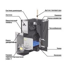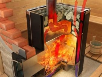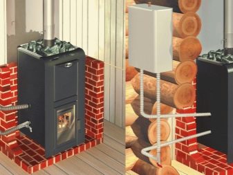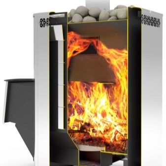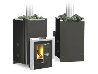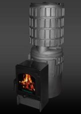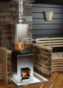 Дизайнът на такава печка има дълга горивна камера, в която на едната има врата за съхранение на дърва за огрев, а другата част е свързана с резервоар, в който има камъни. Съответно такъв удължен дизайн ви позволява да поставите печката в съблекалнята или в съседна стая, а самите горещи камъни ще бъдат в парната баня..