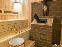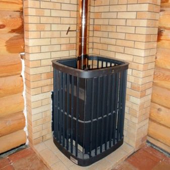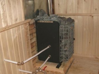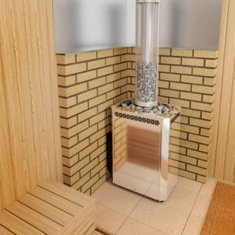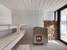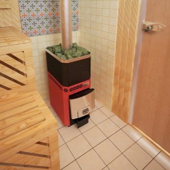 Ето защо, ако общата площ на банята е достатъчна, тогава е по -препоръчително да поставите отдалечена печка в съблекалнята и да оставите само нагревателя в самата парна баня.