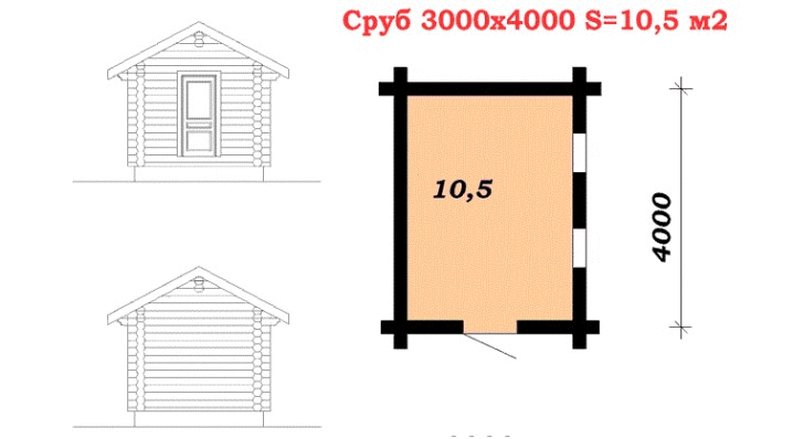 - Разглежданата диаграма показва малка битов блок с площ 10,5 кв. m и параметри на стената 4×3 m. Сградата е оборудвана с солиден и практичен двускатен покрив, има входна врата и 2 странични прозореца, монтирани на една от стените..