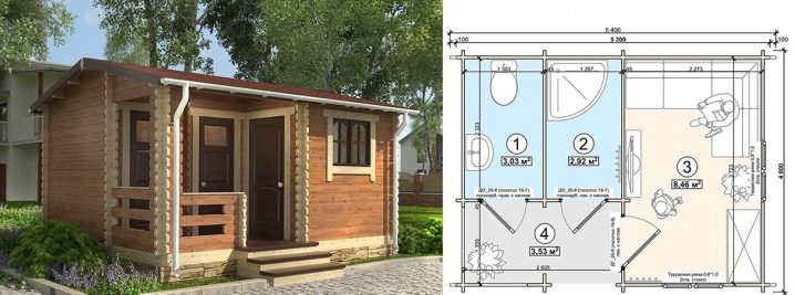 - Hozblok от бар може да служи като малка къща. Разглежданият план предвижда няколко основни зони. В сградата има място за малък кът за гости с площ от 8,46 кв. м, душ -площ – 2.92 кв. м, тоалетна – 3.03 кв. м, както и входната площ – 3.53 кв. м. Ще се окаже много уютна структура, където можете да си починете добре и да се отпуснете в приятелска компания.