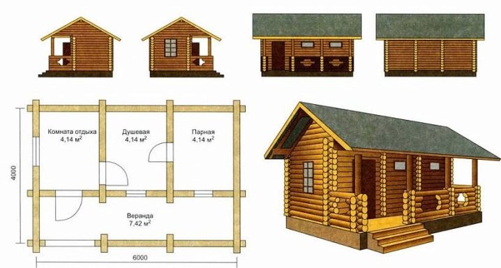 - Дворът ще бъде много просторен и функционален. сграда с размери 6х4. Тук можете да оборудвате не само работната зона на градинаря, но и пълна, удобна вана. На чертежа можете да видите 3 основни стаи, оборудвани в такава структура: стая за отдих (4,14 кв. М), душ кабина (4,14 кв. М), парна баня (4,14 кв. М), както и голяма веранда за 7, 42 кв. м.