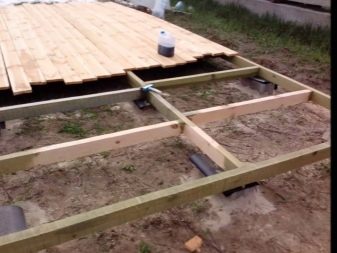 Когато основата е готова, ще трябва да изградите долния сноп на сградата.. Трябва да получите платформа, която допълнително да служи като под и да стане основа за монтаж на стена. За да направите лентата, ще трябва да използвате лента с параметри 50×100 mm. Разстоянието между изоставанията не трябва да е повече от 60 см. Всички дървени материали трябва да бъдат покрити с антисептични защитни средства. За да направите сбруята по -здрава и по -стабилна, можете да използвате прътите с резба, вградени в основата по време на нейното изливане.