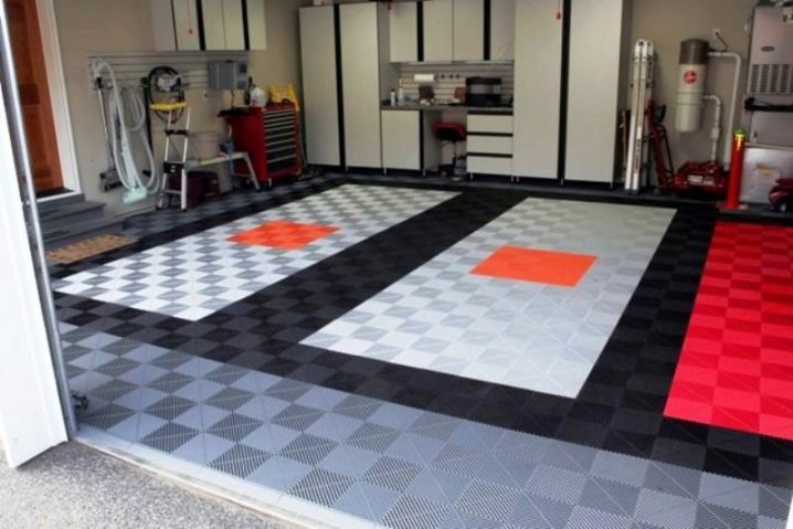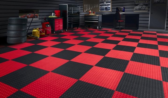 Друго използване на гумени панели е да се редуват цветовете в шахматна дъска. Комбинацията от червено с бяло или черно изглежда ярка, но в същото време минималистична. Това решение е идеално за собственици на големи гаражи. Широките цветни фрагменти придават на помещението жар.