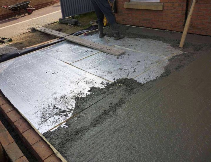 Хидроизолационният материал също се монтира след изливане на бетона и полагане на армировката. Полиетиленът помага за намаляване на изпарението на вода от бетонната маса. Тази техника помага за увеличаване на живота на основата. Стоманобетонната подложка със слой изолация трябва да изсъхне за няколко седмици. Подовата настилка може да се полага само след като основата е напълно изсъхнала..