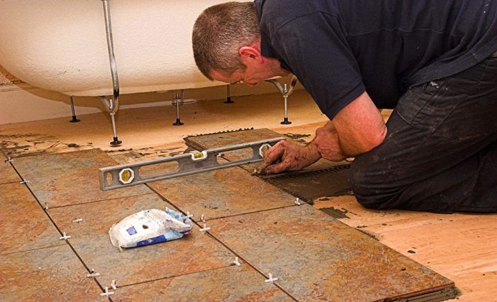 Керамични плочки също се полагат върху груба бетонна основа. Класът на износване на керамичния материал трябва да бъде около 5. Преди полагане на плочките замазката се грундира два пъти и се почиства от прах. Строителното лепило за фиксиране на мозайката се приготвя предварително и се оставя за известно време..