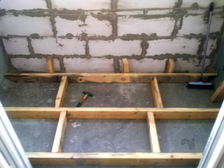 Можете да поставите дървесината върху предварително почистена грундирана бетонна замазка. Барове-лагове се монтират върху замазка със стъпка от 100-200 см. За да се държат дъските, те трябва да бъдат фиксирани с дюбели на всеки половин метър. Стъпката на междинните трупи е 400 милиметра. Дървената основа трябва да бъде покрита със слой хидроизолация.