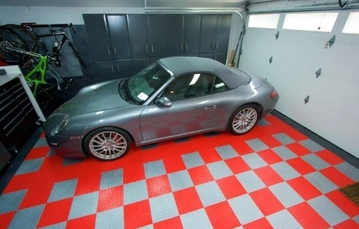 За такъв под е необходимо да се използват облицовки на стени в неутрални нюанси. Светлата боя или мазилка ще бъдат чудесно допълнение към ярка основа. Стаята е изпълнена с въздух и светлина, което не е типично за типичната идея за декориране на гараж. Безпроблемното свързване на плочки създава интересен ефект на потока.