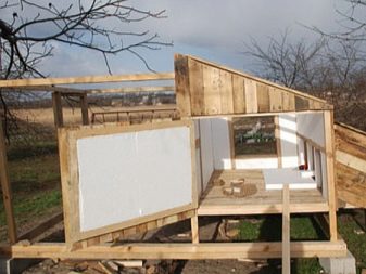 - В основата на бъдещото строителство, дори на етапа на строителството, можете да изградите конструкция от палети за събиране на птичи отпадъци.