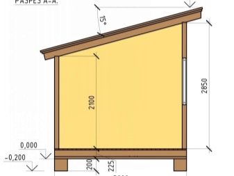 Избирайки чертеж на навес 2×4 м с скатен покрив, е подходящо да обърнете внимание на този пример. Той осигурява врата с височина 2,1 м. Най -високата височина по стената е 2,85 м. Структурата е поставена върху опори с височина 20 см. Това ви позволява да правите без основа.