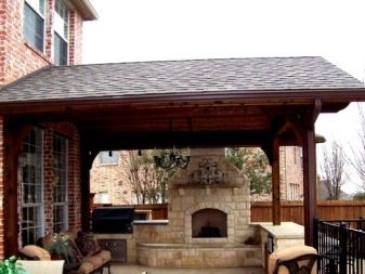 Тази дизайнерска идея има няколко предимства. Прикрепената беседка може да бъде отворена или затворена. В първия случай е необходимо да се погрижите за защита от вятъра, а във втория става възможно да се оборудва друга стая, оранжерия или зимна градина. В просторна беседка е допустимо инсталирането на барбекю или барбекю. В същото време е важно да се помисли не само върху комина и подреждането на покрива, но и върху монтажа на основата..