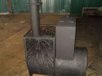 Металните конструкции, направени на ръка, имат приблизително същия вид. Най -простият агрегат с нагревател и всичко необходимо няма да заема много място. Тази печка има вградена горивна камера, така че е предназначена за монтаж в най-малката баня. Домашна конструкция на печката с ковани елементи и резервоар за отопление на вода ще се впишат идеално във всяка баня.