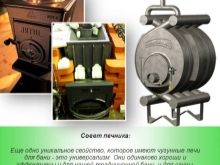 Чугунените печки поддържат температурата дълго време, отделяйки топлина, която е удобна за човек. Топлината е мека, парата е влажна. В същото време няма вредно инфрачервено лъчение, което може да повлияе негативно на здравето.. По отношение на експлоатационния живот, чугунена печка може да се сравни с тухла.