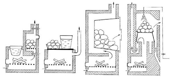 Също така, перспективата за хвърляне на дърва за огрев, ако горивната камера е вътре в парната баня, не изглежда изкушаваща, тъй като случайно изскачащите въглища могат да доведат до факта, че цялата баня ще мига като кибрит.