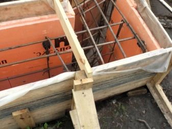 Третата стъпка ще бъде създаването на кофраж. Това може да стане по различни начини. Щитовете могат да бъдат изработени от дъски. Височината на кофража трябва да бъде малко по -голяма от дълбочината на изливането. Ако основата е блокова, тогава е най-добре да направите рамка от несменяем тип. Можете или да си купите мухъл, или да го направите сами от плочи. Вътре такава структура трябва да бъде увита във фолио. Това е необходимо, за да не се абсорбира влагата в дървото, което може да причини неравен бетон и намаляване на здравината на сградата..