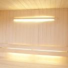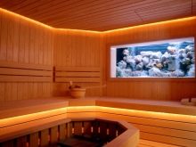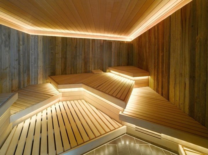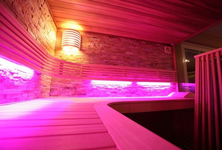 - LED светлини – истински фетиш за декораторите. Но в случай на парна баня, те имат малко ограничено приложение. Светодиодите при нормални условия служат в пъти по -дълго от конвенционалните лампи, но при високи температури бързо се провалят. Ако решите да ги инсталирате в парна баня, поставете ги близо до пода (под или зад рафтове). Осветлението може да бъде доста ярко и във всеки цвят. LED лентата трябва да бъде залепена към незапалими и екологично чисти субстрати, като се използват безопасни формулировки..
