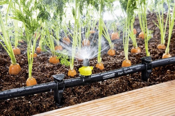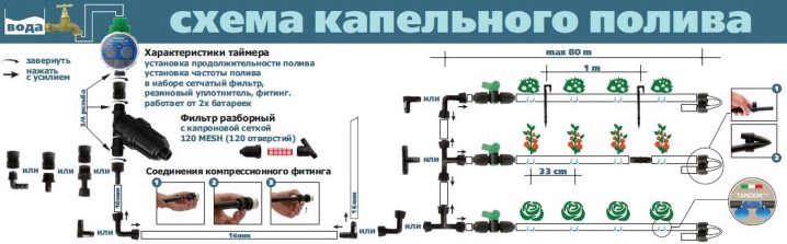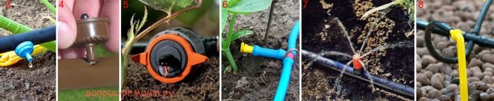 Независимо от вида на монтираната система, е необходимо да се направи сгъваем капкомер. Почти винаги разстоянието между капкомерите трябва да бъде 0,3 м. Но има растения, които трябва да се напояват по различна схема. Когато доставяте вода на многогодишни култури, най -добре е да използвате паяци. Водопроводът за тях трябва да бъде оформен в окачена версия. Кореноплодите се напояват на разстояние 0,2 м, а разстоянието между поливните точки за пъпеши и кратуни е 1 м.