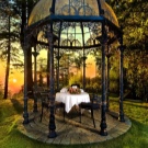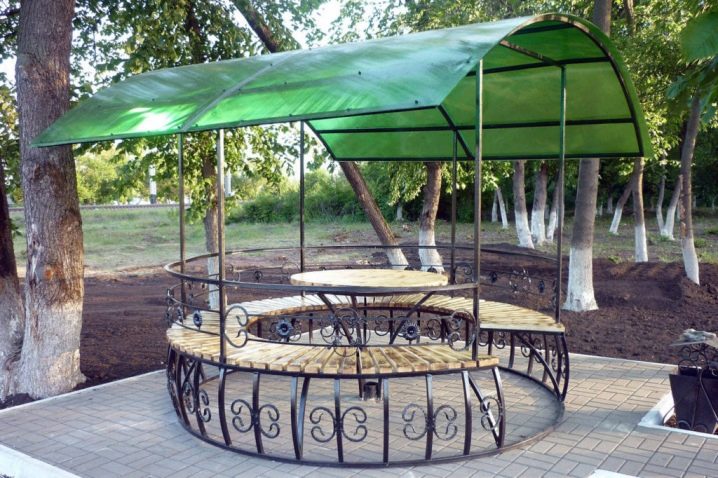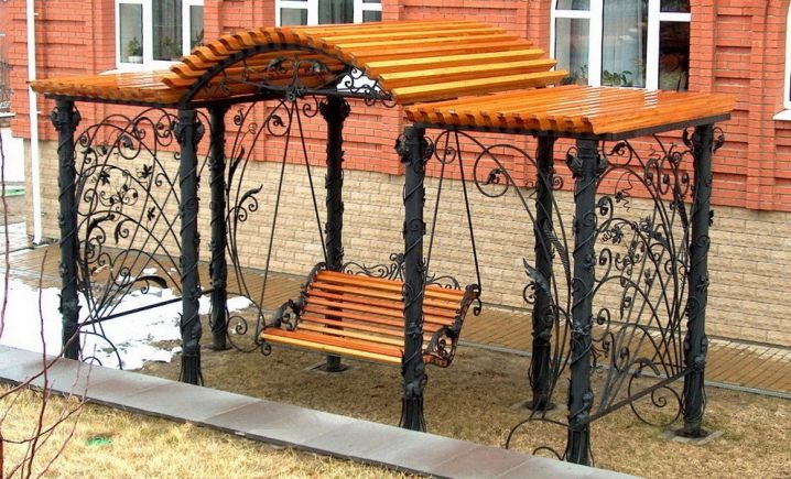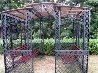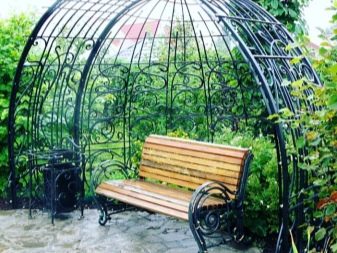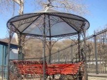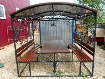 Страничните части на конструкцията са най -добре украсени с коване, това могат да бъдат къдрици или мигли на растения. Ако искате да създадете по -защитена зона от слънцето, можете да засадите високи катерещи растения наблизо, които бързо ще сплетят цялата структура. Тази опция е идеална за един човек или двойка, които рядко чакат гости и често прекарват времето си в спокойно съзерцание на природата..