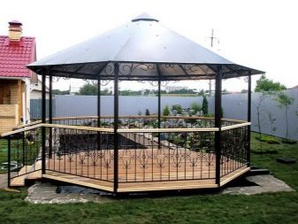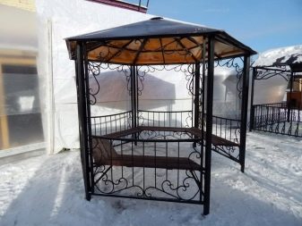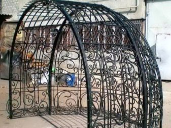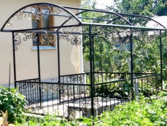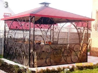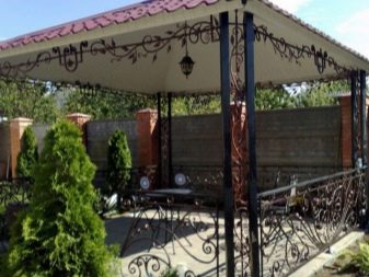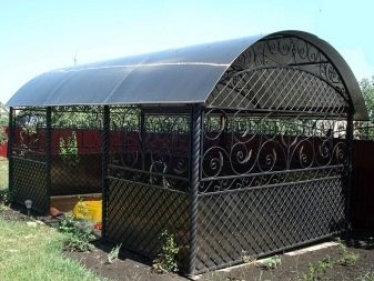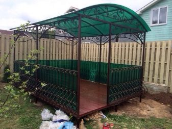 Покривът може да бъде изработен от поликарбонат, метален профил, хастар, дърво. Долната част може да бъде допълнително рамкирана или просто декорирана с коване. Последният вариант е по -скъп, но много по -красив, освен това позволява на въздуха да преминава по -добре вътре в конструкцията..